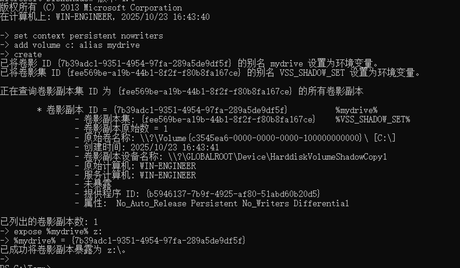 创建以下文件内容script.txt set context persistent nowriters add volume c: alias mydrive create expose %mydrive% z: 随后在有权限的位置(无权限自己在C盘下创建一个目录)运行diskshadow /s script.txt