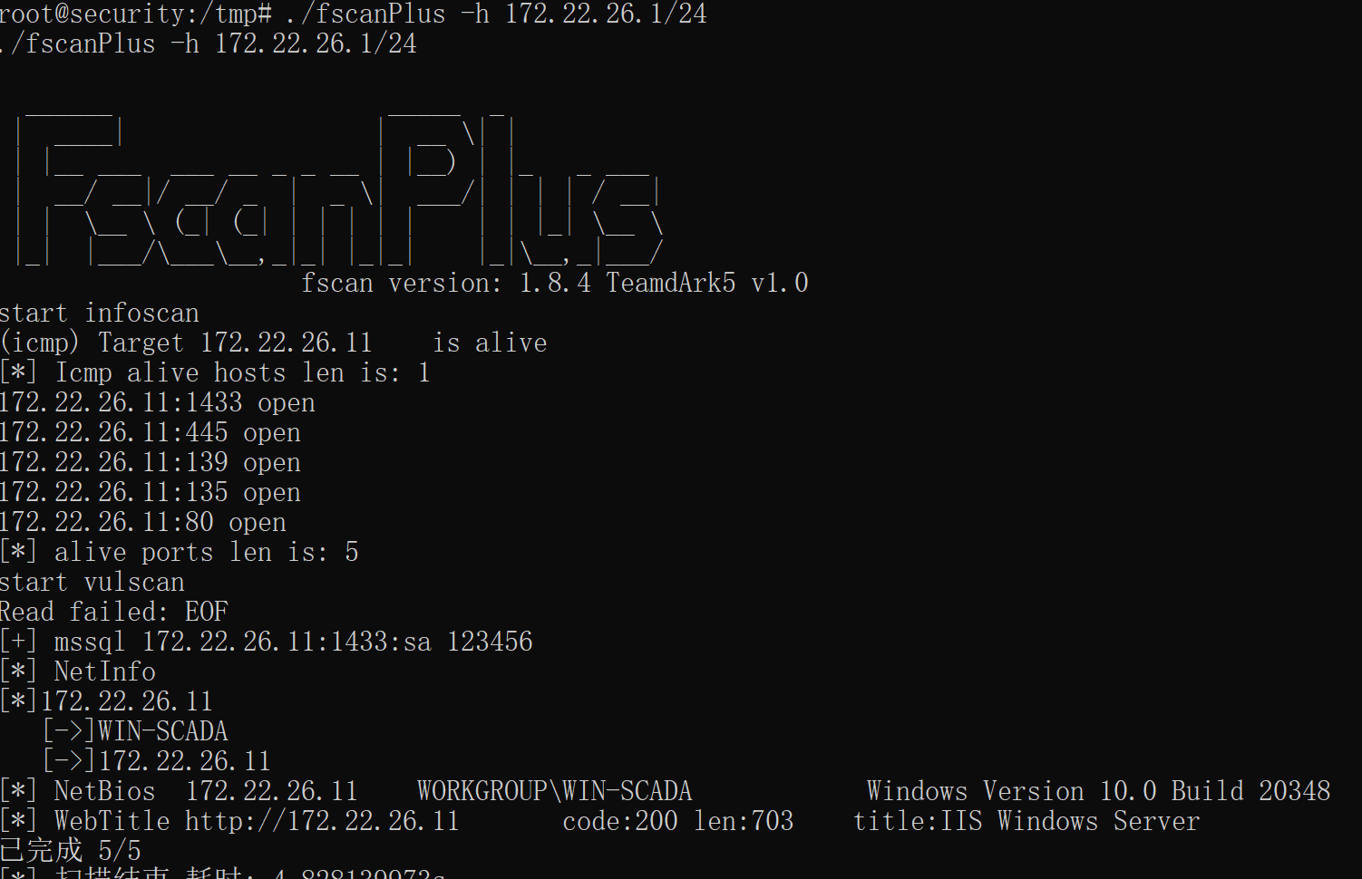 | 172.22.17.6:445 open 172.22.17.6:139 open 172.22.17.6:135 open 172.22.17.6:80 open 172.22.17.6:21 open 172.22.17.213:22 open 172.22.17.213:8181 open [*] alive ports len is: 8 start vulscan [*] NetInfo [*]172.22.17.6 [->]WIN-ENGINEER [->]172.22.17.6 Read failed: EOF [*] WebTitle http://172.22.17.213:8080 code:302 len:0 title:None 跳转url: http://172.22.17.213:8080/login;jsessionid=7D4C35CD42694F9F629123B884E7757C [*] WebTitle http://172.22.17.213:8080/login;jsessionid=7D4C35CD42694F9F629123B884E7757C code:200 len:2936 title:火创能源监控画面管理平台 [+] ftp 172.22.17.6:21:anonymous [->]Modbus [->]PLC [->]web.config [->]WinCC [->]内部软件 [->]火创能源内部资料 [*] NetBios 172.22.17.6 WORKGROUP\WIN-ENGINEER Windows Version 10.0 Build 20348 [*] WebTitle http://172.22.17.6 code:200 len:661 title:172.22.17.6 - / [+] PocScan http://172.22.17.213:8080 poc-yaml-spring-actuator-heapdump-file [+] PocScan http://172.22.17.213:8080 poc-yaml-springboot-env-unauth spring2