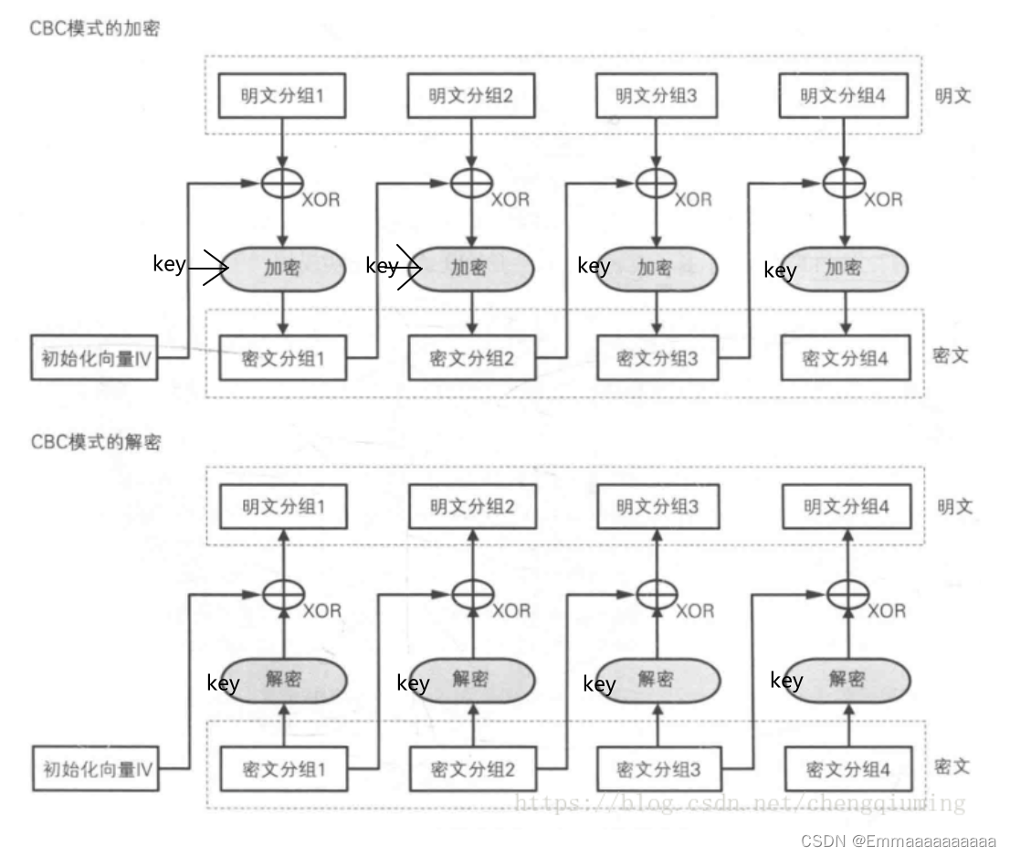 模式中每一个分组要先和前一个分组加密后的数据进行XOR异或操作,然后再进行加密。