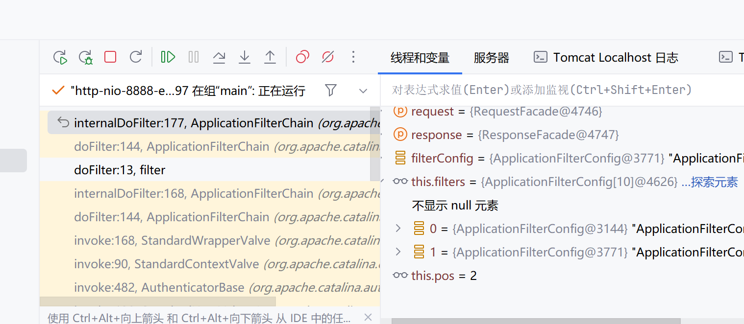 这里就一直循环,上一个 Filter.doFilter() 方法中调用 FilterChain.doFilter() 方法将调用下一个 Filter.doFilter() 方法,最后一个Filter调用Servlet.service()