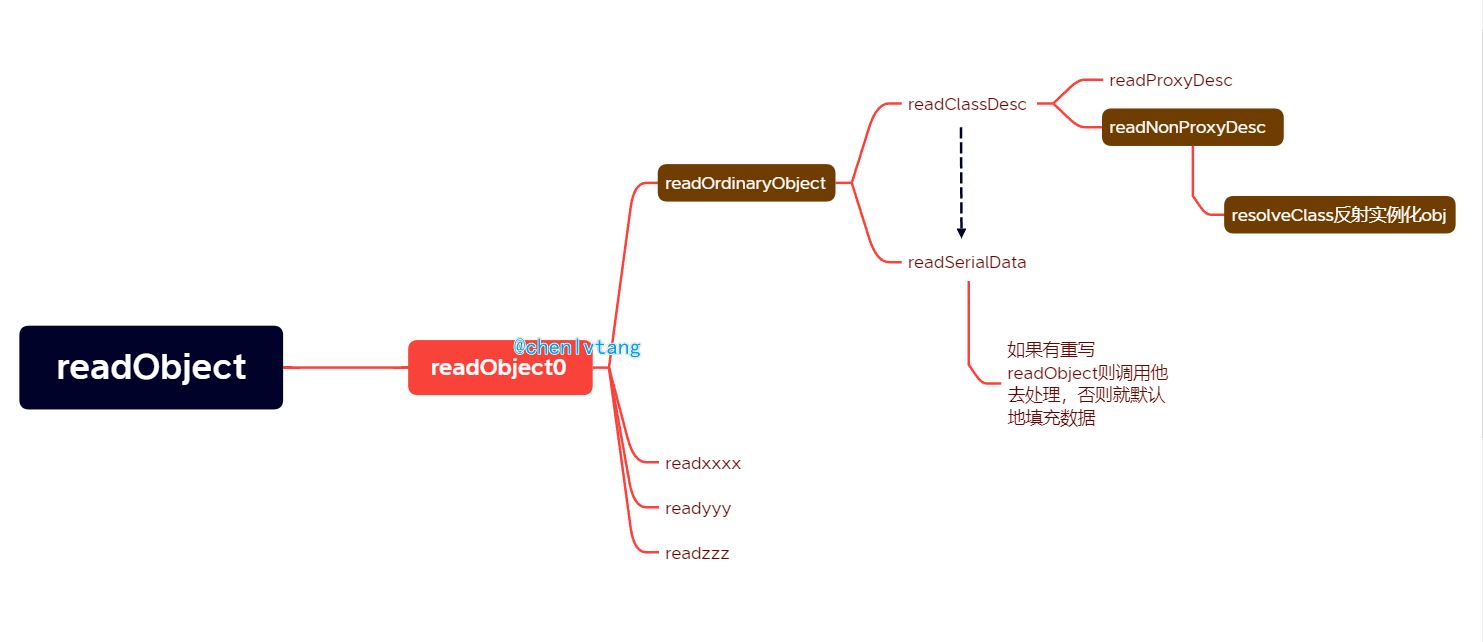 bin.setBlockDataMode(true); slotDesc.invokeReadObject(obj, this);//调用重写的readObject } catch (ClassNotFoundException ex) { /* * In most cases, the handle table has already * propagated a CNFException to passHandle at this * point; this mark call is included to address cases * where the custom readObject method has cons'ed and * thrown a new CNFException of its own. */ handles.markException(passHandle, ex); } finally { curContext.setUsed(); if (oldContext!= null) oldContext.check(); curContext = oldContext; }