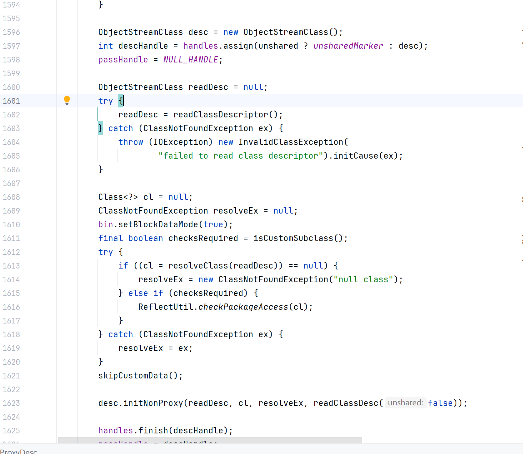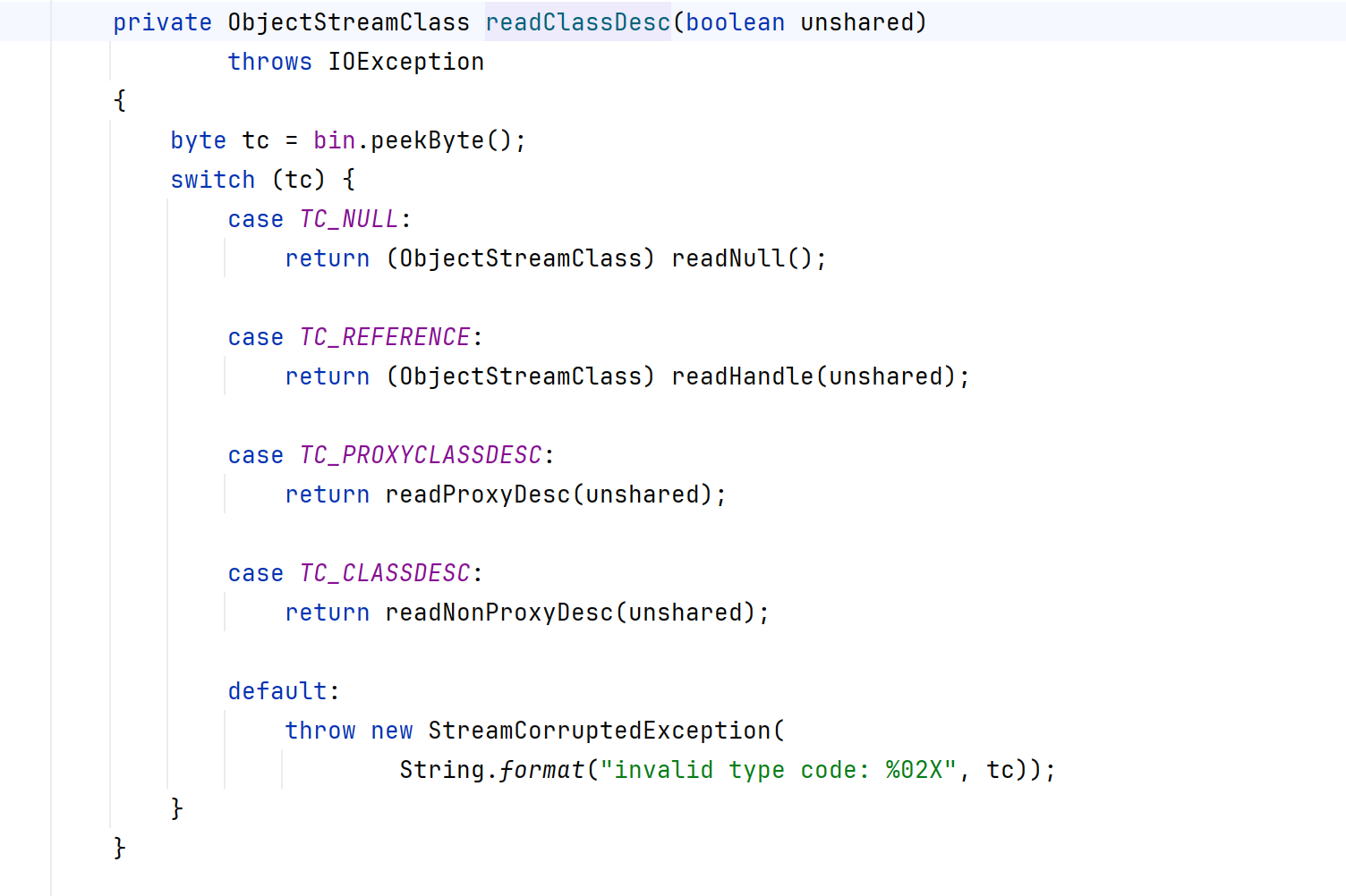 case TC_CLASSDESC: case TC_PROXYCLASSDESC: return readClassDesc(unshared);
